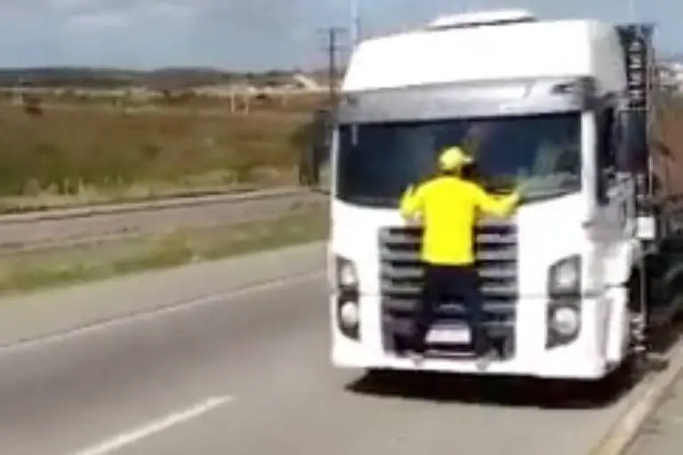 No vídeo que mostra o caso nas redes sociais, contudo, o motorista do caminhão narra outra versão. Ele afirma que "o cara subiu aí e disse que não vai descer". Reveja o vídeo: