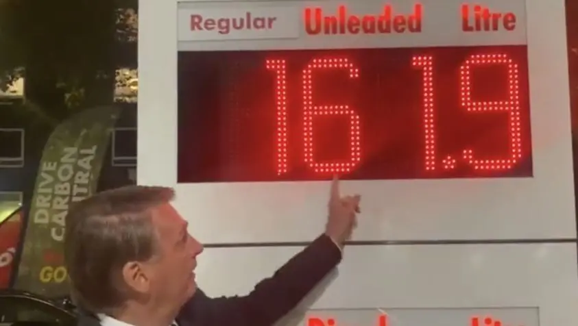 "Estou aqui em Londres, Inglaterra. O preço da gasolina: 1.61 libras (esterlinas). Isso dá aproximadamente R$ 9,70 o litro. Ou seja, praticamente o dobro da média de muitos estados no Brasil", iniciou o candidato à reeleição.