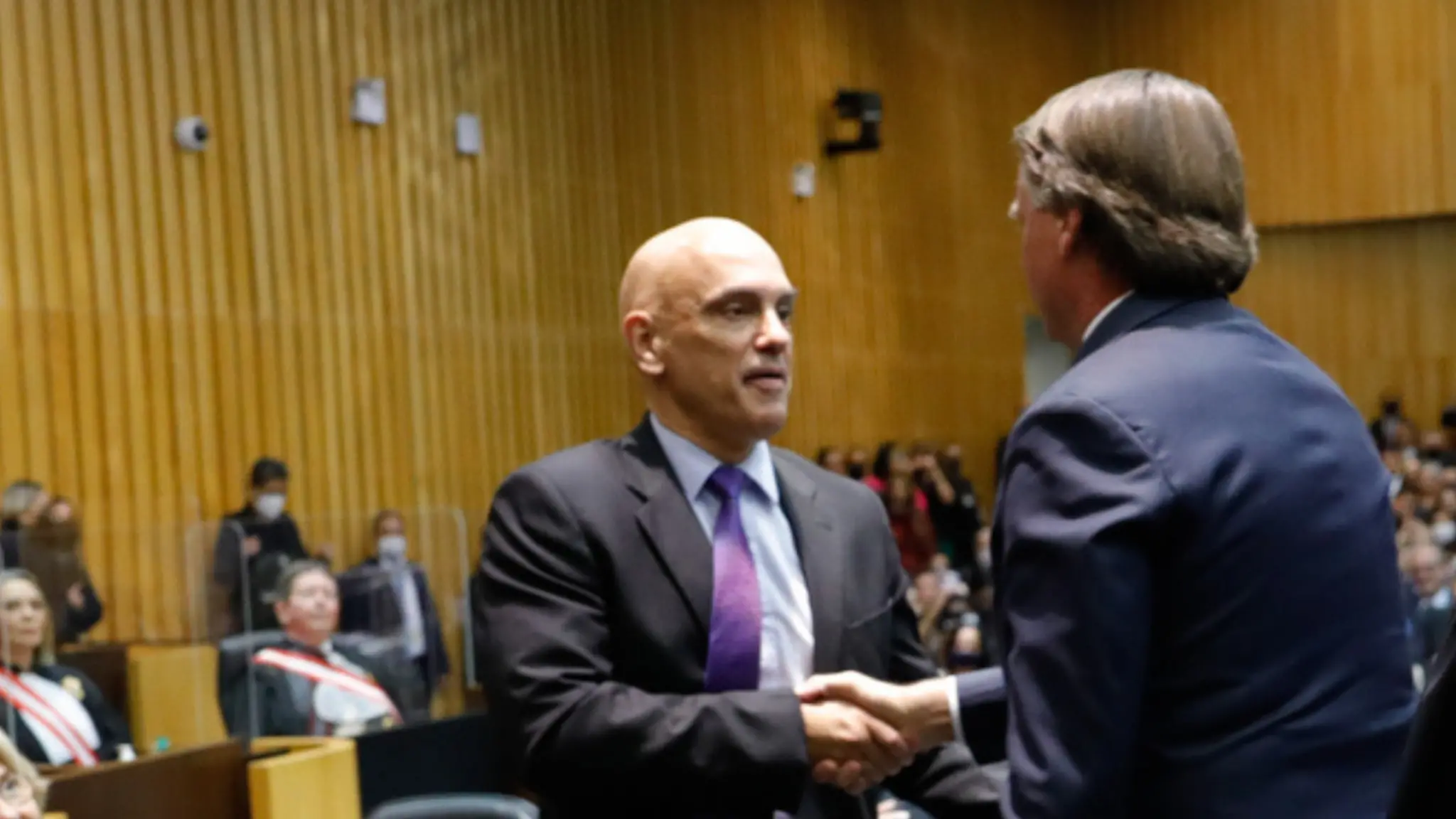 Enquanto o político se levantou para felicitar os ministros empossados, Moraes seguiu sentado, ao lado dos demais ministros. Em seguida, o presidente seguiu em direção a ele e fez um gesto com as mãos para ele, indicando que ele levantasse, e o cumprimentou com um aperto de mãos e batidas no ombro.