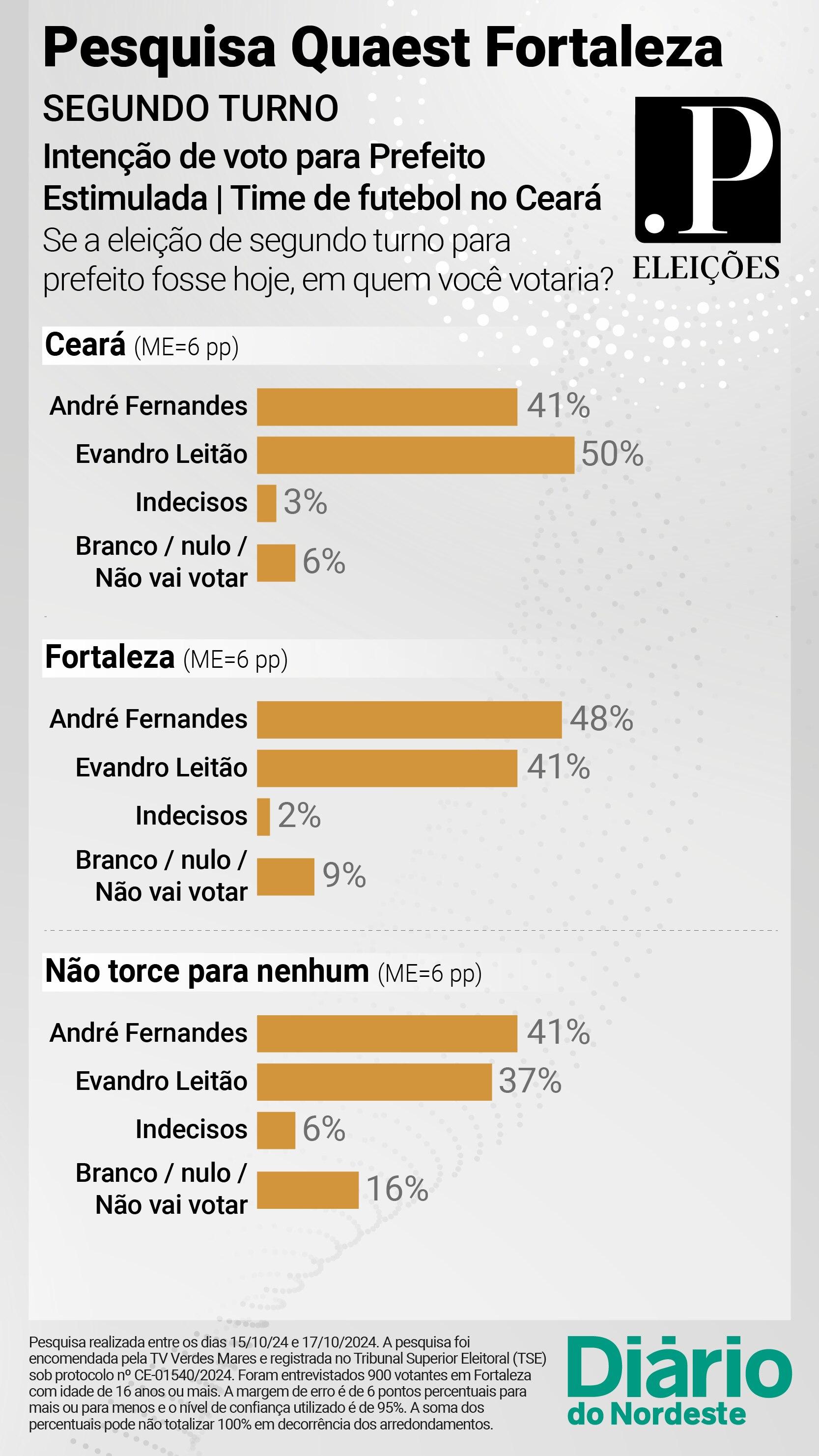 Entre os torcedores do Ceará, 41% disseram que pretendem votar em André Fernandes (PL), 50% em Evandro Leitão (PT), 3% alegou estar indeciso e 6% afirmou que irá votar em branco, anular ou não irá nem mesmo votar.