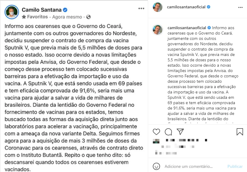 Por meio das redes sociais, Camilo Santana lamentou a suspensão do contrato ao citar a eficácia do imunobiológico. "A Sputnik V, que está sendo usada em 69 países e tem eficácia comprovada de 91,6% seria mais uma vacina para ajudar a salvar a vida de milhares de brasileiros", escreveu.