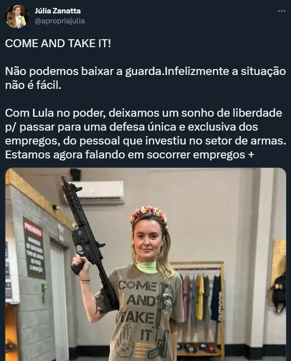 "Não podemos baixar a guarda. Infelizmente a situação não é fácil. Com Lula no poder, deixamos um sonho de liberdade para passar para uma defesa única e exclusiva dos empregos, do pessoal que investiu no setor de armas. Estamos agora falando em socorrer empregos e lutar por segurança jurídica", escreveu Julia Zanatta.