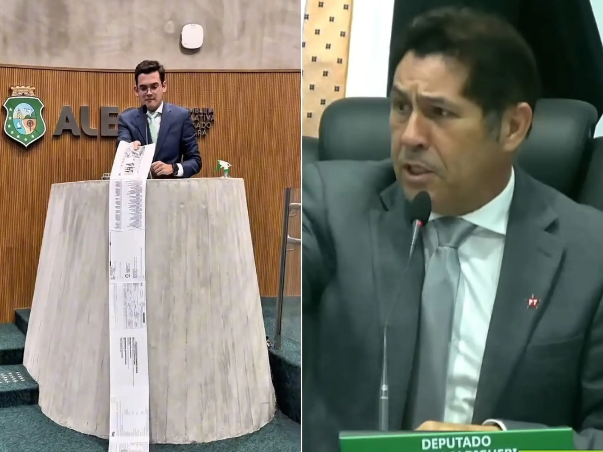 Os deputados estaduais Carmelo Neto (PL) e De Assis Diniz (PT) protagonizaram um bate-boca durante a sessão da Assembleia Legislativa do Ceará (Alece) desta quinta-feira (10). A discussão foi registrada durante o pronunciamento do parlamentar do PL, que levou um “pergaminho com provas” ao Plenário da Casa, no qual acusava o presidente Luiz Inácio Lula da Silva (PT) de corrupção.