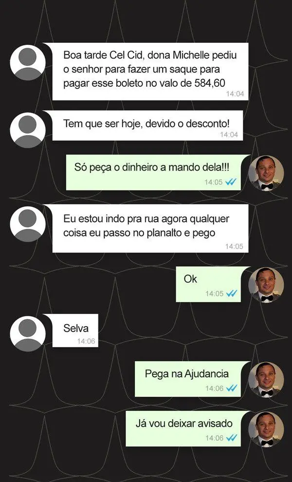 As tratativas eram feitas por meio do Whatsapp e as mensagens são investigadas pela equipe do ministro do STF Alexandre de Moraes. Em uma dessas conversas, Cid diz "Só peça dinheiro a mando dela".