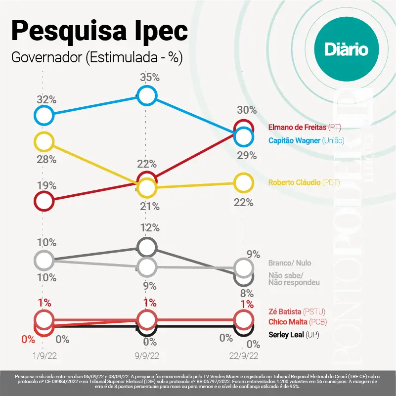 A primeira pesquisa Ipec para o Governo do Estado foi divulgada no último dia 1º de setembro. Nela, Capitão Wagner e Roberto Cláudio estavam tecnicamente empatados. O candidato do União Brasil estava numericamente à frente, com 32% das intenções de votos, Roberto Cláudio tinha 28% e Elmano de Freitas (PT) era apontado por 19% dos entrevistados.