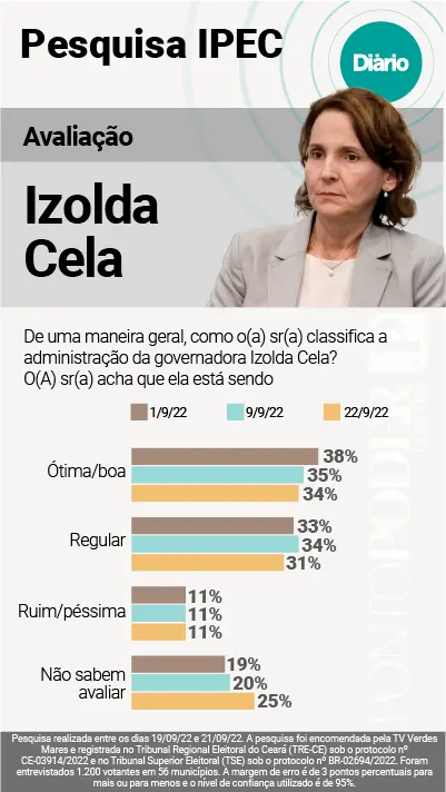 No dia 1º de setembro, o Diário do Nordeste divulgou a primeira rodada da pesquisa Ipec com avaliação do Governo Izolda. À época, a gestão da mandatária era avaliada como ótima ou boa por 38% dos cearenses. Já outra parcela, de 33%, considerava o atual governo como regular.