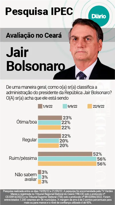 Na primeira rodada de pesquisa, o presidente teve a gestão avaliada como ruim ou péssima por 52% dos cearenses. Entre os entrevistados, 23% consideraram o governo ótimo ou bom, enquanto 22% apontaram como regular. Outros 3% não souberam opinar.