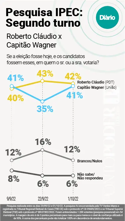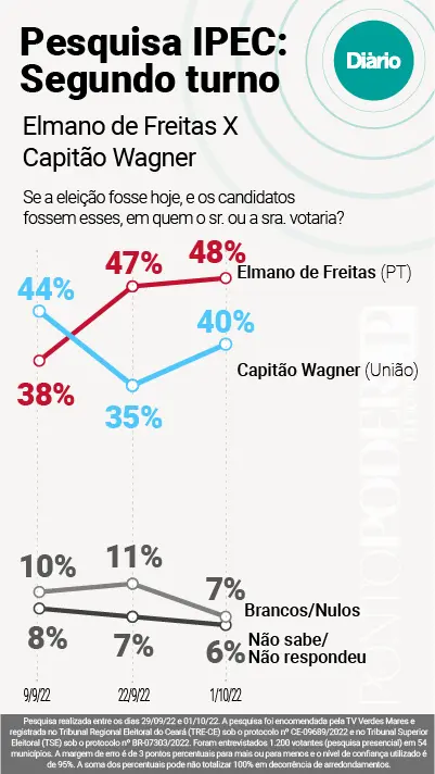 O levantamento foi realizado pelo instituto Ipec Inteligência e está registrado no Tribunal Superior Eleitoral (TSE) sob número BR-07303/2022 e no Tribunal Regional Eleitoral do Ceará (TRE-CE) sob protocolo CE-09689/2022. O nível de confiança estimado é de 95%.