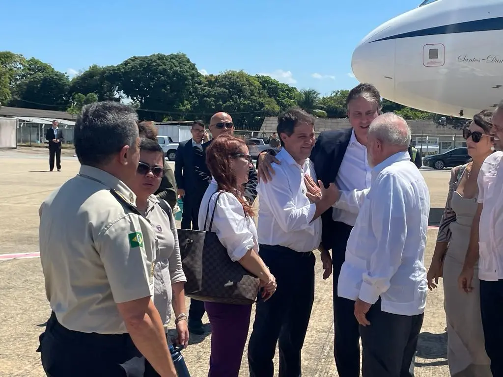 Após o desembarque, Lula seguiu direto para a Base Aérea de Fortaleza, onde ocorre a solenidade de lançamento da Pedra Fundamental do campus do ITA. Apenas Evandro Leitão está no palco do evento, enquanto Larissa Gaspar e Guilherme Sampaio participam da cerimônia no público.