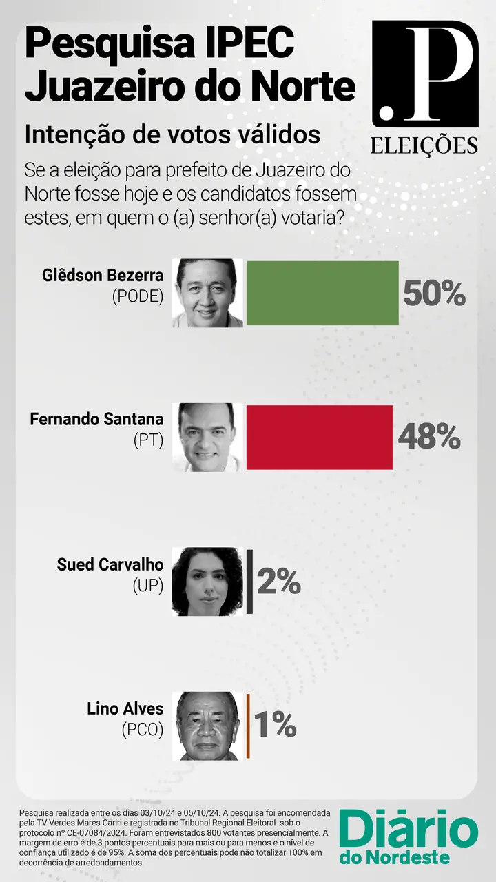 A terceira rodada da pesquisa Ipec para a disputa pela Prefeitura de Juazeiro do Norte divulgada, neste sábado (5), indica o candidato Glêdson Bezerra (Podemos) com 50% das intenções de votos válidos, seguido de Fernando Santana (PT) com 48%. Os dois estão tecnicamente empatados dentro da margem de erro.