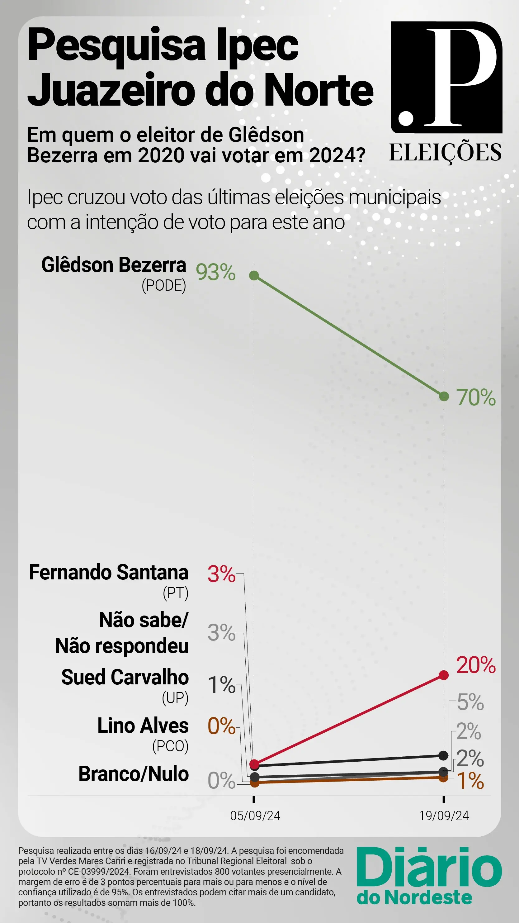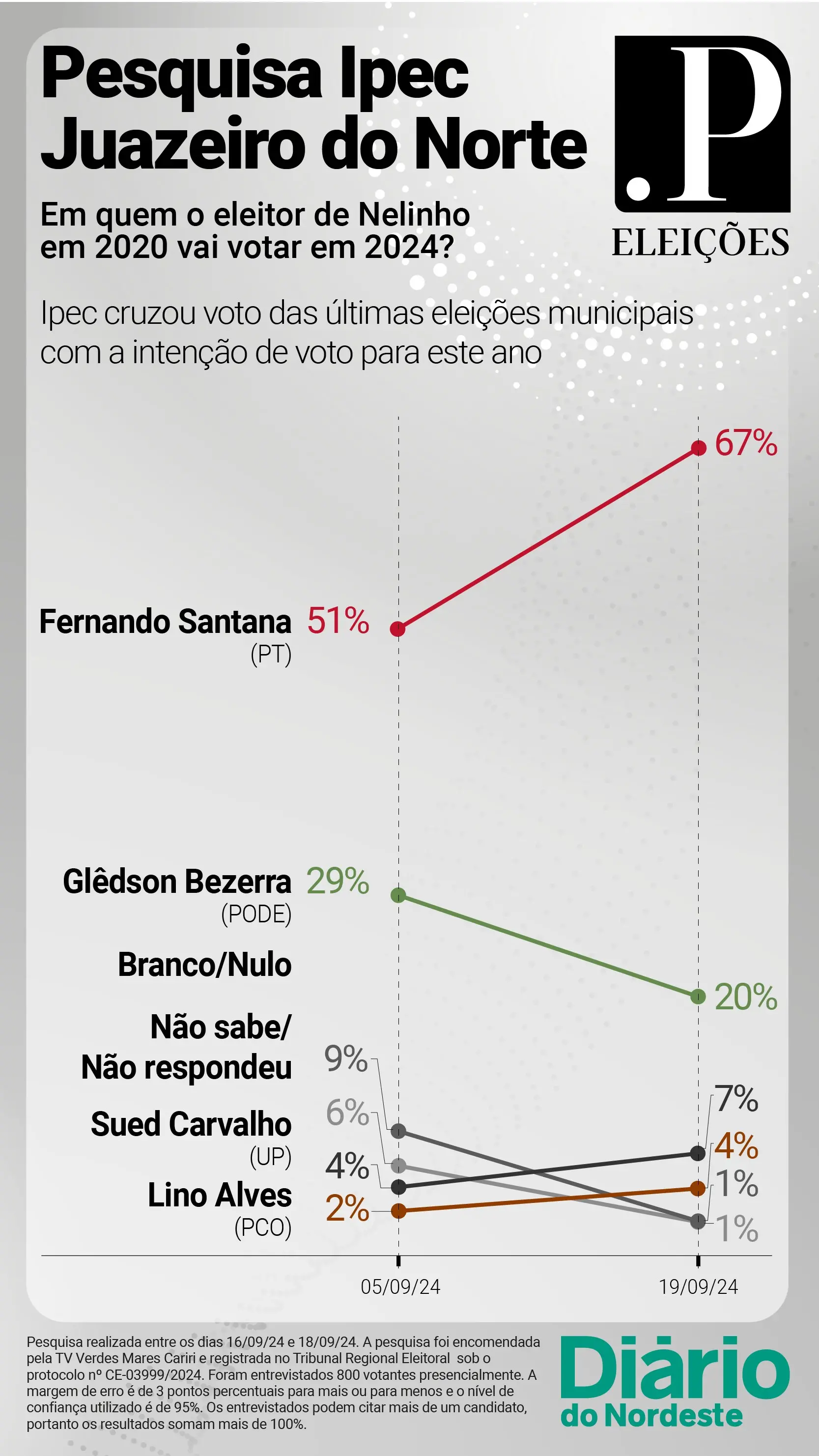 O levantamento foi encomendado pela TV Verdes Mares Cariri e ouviu 800 eleitores de Juazeiro do Norte entre os dias 16 e 18 de setembro