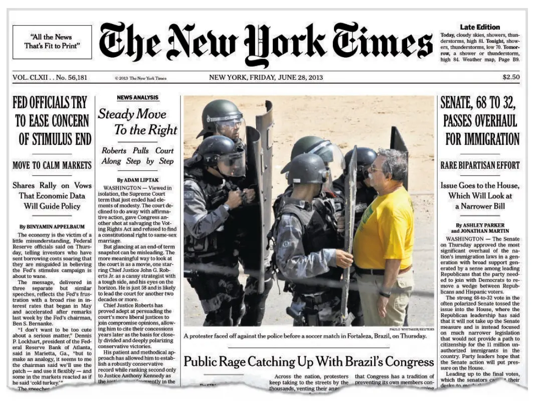 Capa do jornal americano The New York Times (NYT) em junho de 2013, o juiz cearense aposentado Silvio Mota chamou atenção da imprensa internacional ao enfrentar, sozinho, uma barreira policial durante uma manifestação, na Copa das Confederações, em Fortaleza.