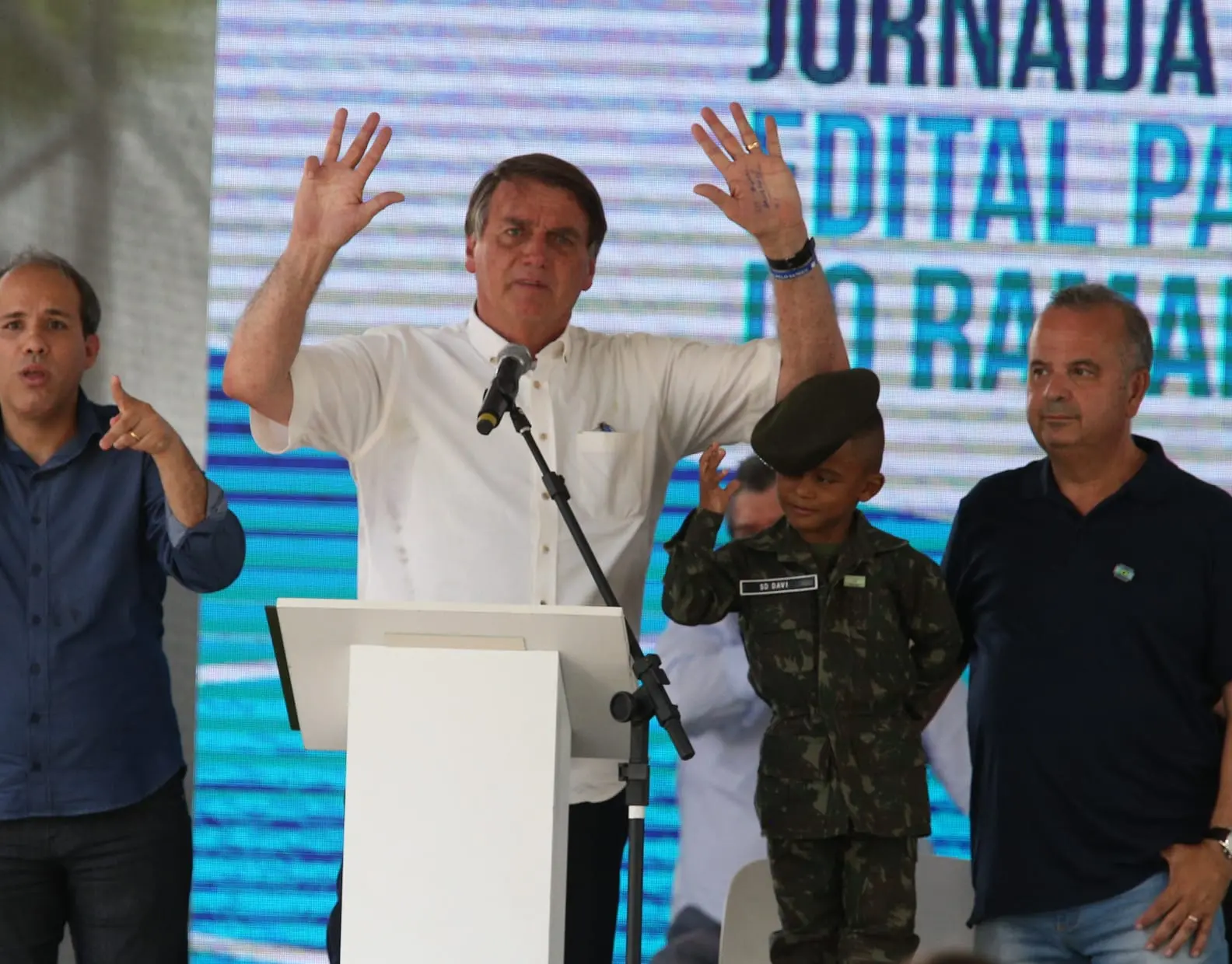 “Um terço é nordestino, outro é militar e outro é variado. Todos eles estão irmanados no mesmo objetivo”, disse Bolsonaro ao lado do ministro Rogério Marinho, do Desenvolvimento Regional.