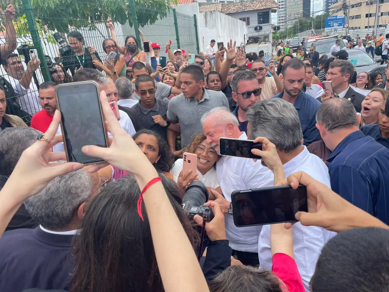 Lula quebra protocolo em Fortaleza e cumprimenta apoiadores do lado de fora da Escola Johnson
