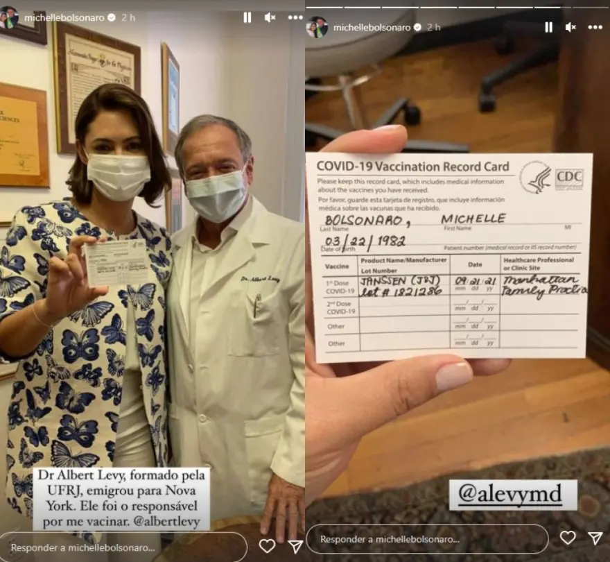 A esposa de Jair Bolsonaro publicou duas fotos. Na primeira, Michelle aparece ao lado do médico Albert Levy, responsável por vacina-lá. Conforme disse, ele teria emigrado para Nova Iorque após se formar na Universidade Federal do Rio de Janeiro (UFRJ). Albert é médico da família e atua na Manhattan Family Practice, uma clínica privada, na Park Avenue, em Nova Iorque.