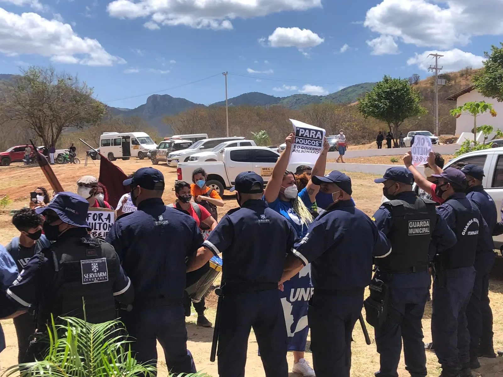 Agentes da Guarda Municipal de Itapajé e seguranças terceirizados tentaram conter os manifestantes, que gritavam palavras de ordem contra o Governo Federal enquanto tentavam ultrapassar o cordão de isolamento.