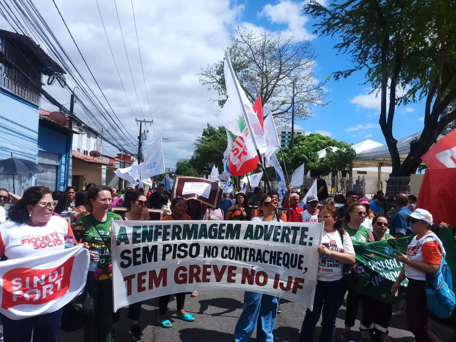 Durante o ato, eles cobraram a reabertura do diálogo sobre o pagamento do piso da Enfermagem para toda a categoria de Fortaleza e da negociação sobre a atualização do Plano de Cargos, Carreiras e Salários (PCCS) da Guarda e Defesa Civil da Capital.