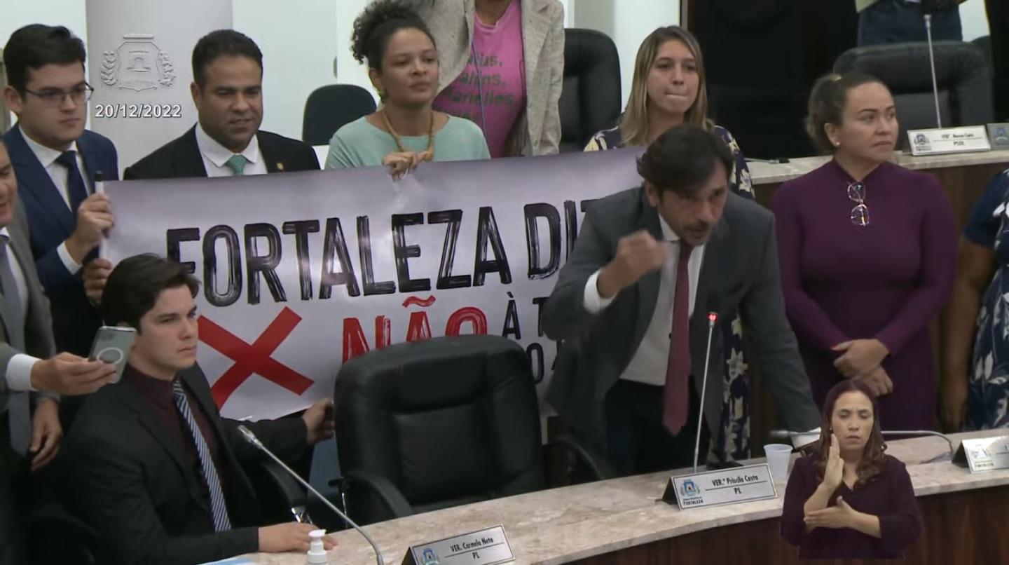 "Independe de partido, de ideologia política, isso aqui é um movimento de discussão do mérito da matéria, de pessoas que estão contrárias a essa matéria. Uma matéria que a gente debateu, viu e discutiu, alertou para várias irregularidades, uma matéria que não é obrigatória, em um momento muito inoportuno para cobrar uma taxa da população de Fortaleza", criticou Brizzi.