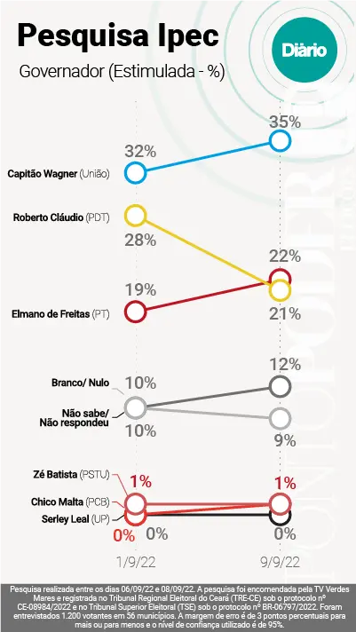 A primeira pesquisa Ipec para o Governo do Estado foi divulgada no último dia 1º de setembro. Nela, Capitão Wagner e Roberto Cláudio estavam tecnicamente empatados. Wagner estava numericamente à frente, com 32% das intenções de votos, Roberto Cláudio tinha 28% e Elmano de Freitas (PT) era apontado por 19% dos entrevistados.