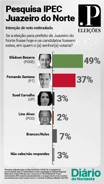 A primeira pesquisa Ipec para a disputa pela Prefeitura de Juazeiro do Norte, divulgada nesta quinta-feira (5), indica o candidato à reeleição Glêdson Bezerra (Podemos) com 49% das intenções de voto, seguido de Fernando Santana (PT) com 37%. Sued Carvalho (UP) e Lino Alves (PCO) aparecem em seguida com 3% e 2%, respectivamente. Na modalidade estimulada, os nomes dos candidatos são apresentados à pessoa entrevistada ao lado da identificação de qual partido são filiados.
