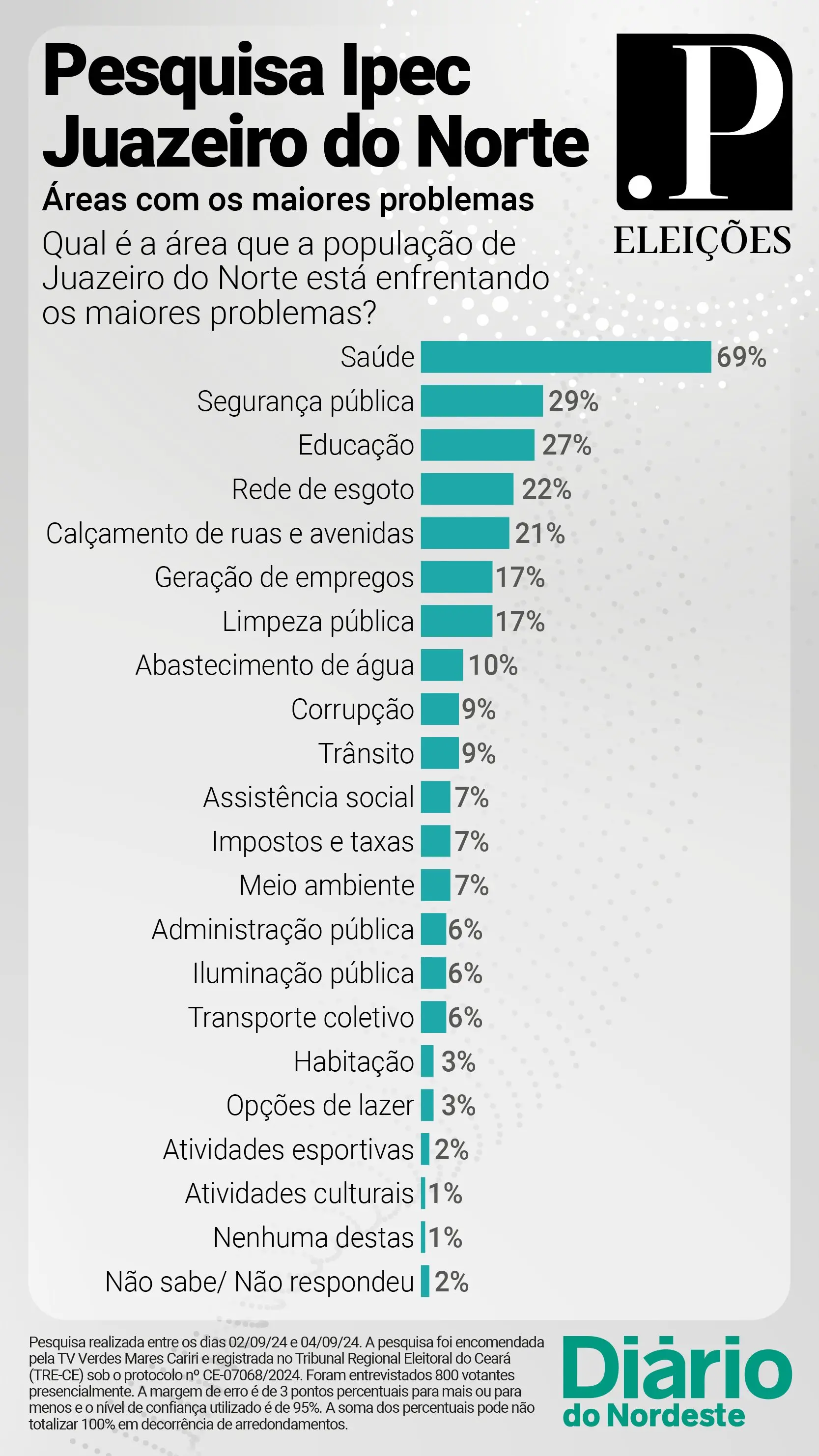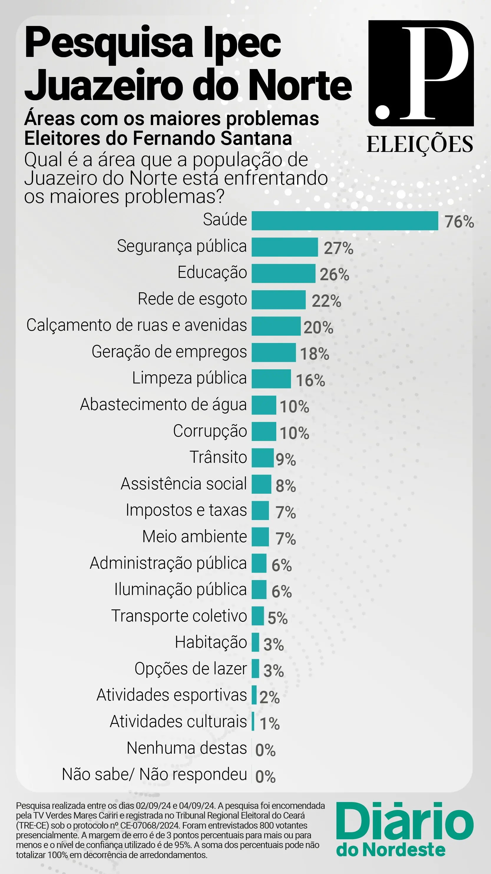 No levantamento, encomendado pela TV Verdes Mares Cariri, 800 eleitores de Juazeiro do Norte, com 16 anos ou mais, foram ouvidos entre os dias 2 e 4 de setembro. Na ocasião, o instituto fez a seguinte pergunta: “Desta lista de áreas onde as pessoas vêm enfrentando problemas de maior ou menor gravidade, diga qual é a área em que, na sua opinião, a população de Juazeiro do Norte está enfrentando os maiores problemas”.