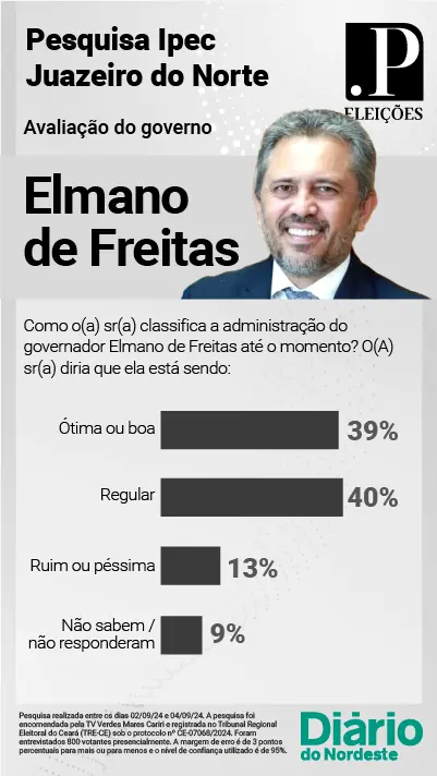 Os entrevistados também avaliam o desempenho de Elmano de Freitas no comando do Governo do Ceará. O petista exerce seu primeiro mandato no Executivo estadual e acumula 40% de avaliação regular, o que representa, numericamente, a maior fatia dos eleitores ouvidos na pesquisa.