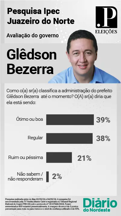 Em meio ao último semestre do primeiro mandato como prefeito de Juazeiro do Norte, Glêdson Bezerra disputa a reeleição na cidade caririense. Na pesquisa, os eleitores avaliaram o desempenho do candidato na gestão. Numericamente, a maior fatia, 39%, diz que o mandatário faz um trabalho ótimo ou bom.