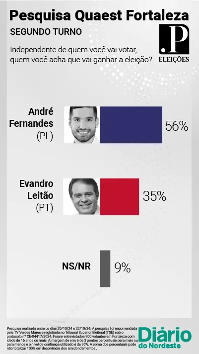 Para 56% dos entrevistados, André Fernandes (PL) é quem vai ganhar a eleição. O candidato Evandro Leitão (PT) é apontado como possível vencedor por 35% dos entrevistados. Não sabem ou não responderam correspondem a 9%.