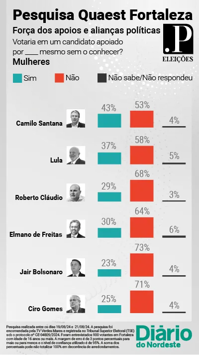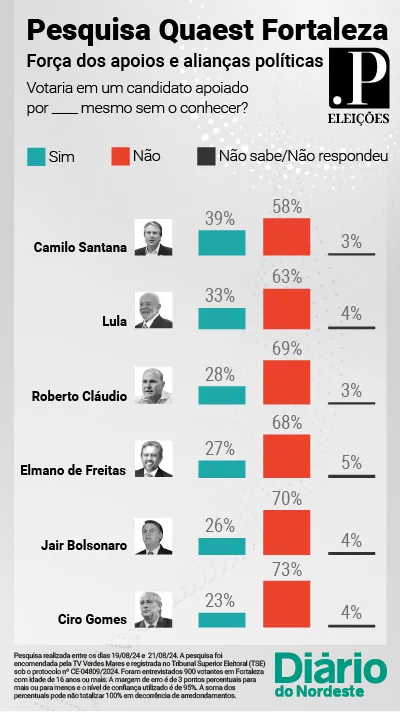 Na análise, encomendada pela TV Verdes Mares, foi questionada qual influência teria no voto o apoio dos seguintes políticos: o ministro da Educação, Camilo Santana (PT); o presidente Lula (PT); o ex-presidente, Jair Bolsonaro (PL); o ex-prefeito de Fortaleza, Roberto Cláudio (PDT); o governador do Ceará, Elmano de Freitas (PT); e o ex-ministro, Ciro Gomes (PDT).
