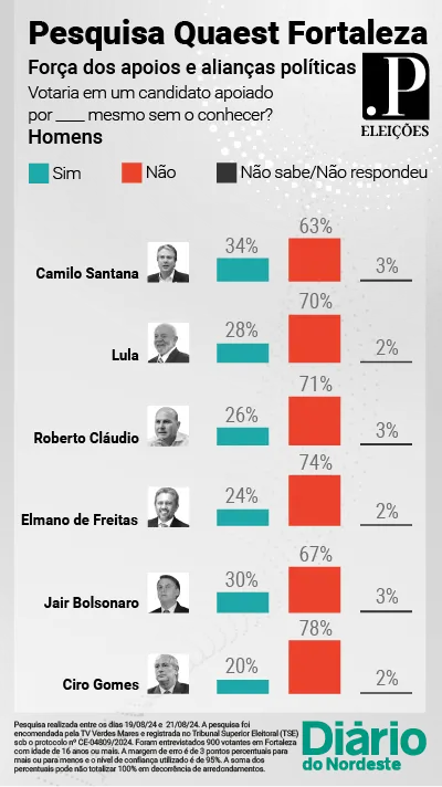 No caso dos homens, cuja margem de erro é de 5%, Camilo tem o maior peso de respostas sim ao candidato indicado (com 34% dos entrevistados), mas a ordem seguinte daquela constatada entre o público feminino. Nesse caso, quando o candidato é apoiado por Bolsonaro, 30% dos entrevistados indicaram que votariam; seguido de Lula (28% votariam); Roberto Cláudio (26% votariam); Elmano (24% votariam) e Ciro Gomes (20% votariam).
