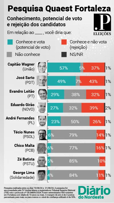A pesquisa foi realizada pelo instituto Quaest e está registrado no Tribunal Superior Eleitoral (TSE) sob protocolo CE-04809/2024. O índice de confiança é de 95%. Os 900 eleitores foram ouvidos de forma presencial em bairros da capital cearense.
