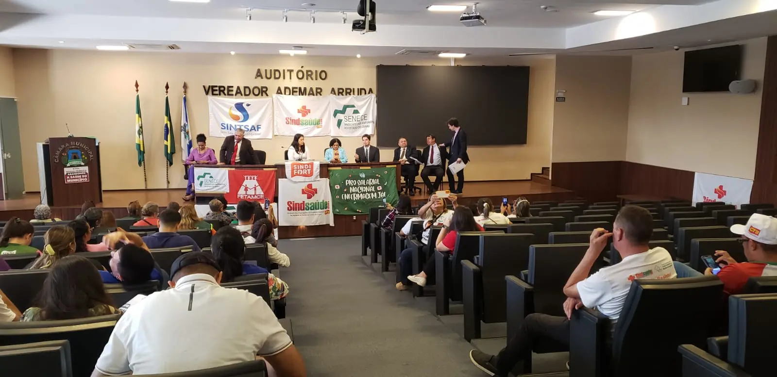 Sindicatos representativos da enfermagem em Fortaleza fizeram protesto nesta terça-feira (27), na Câmara Municipal, para pressionar pela aplicação do piso da categoria e buscar um canal de diálogo com a Prefeitura sobre os reajustes salariais. Após conversa com vereadores, dentre eles o líder do Governo, Carlos Mesquita (PDT), há a expectativa da realização de uma audiência pública sobre o tema e de tratativas junto ao prefeito José Sarto (PDT).
