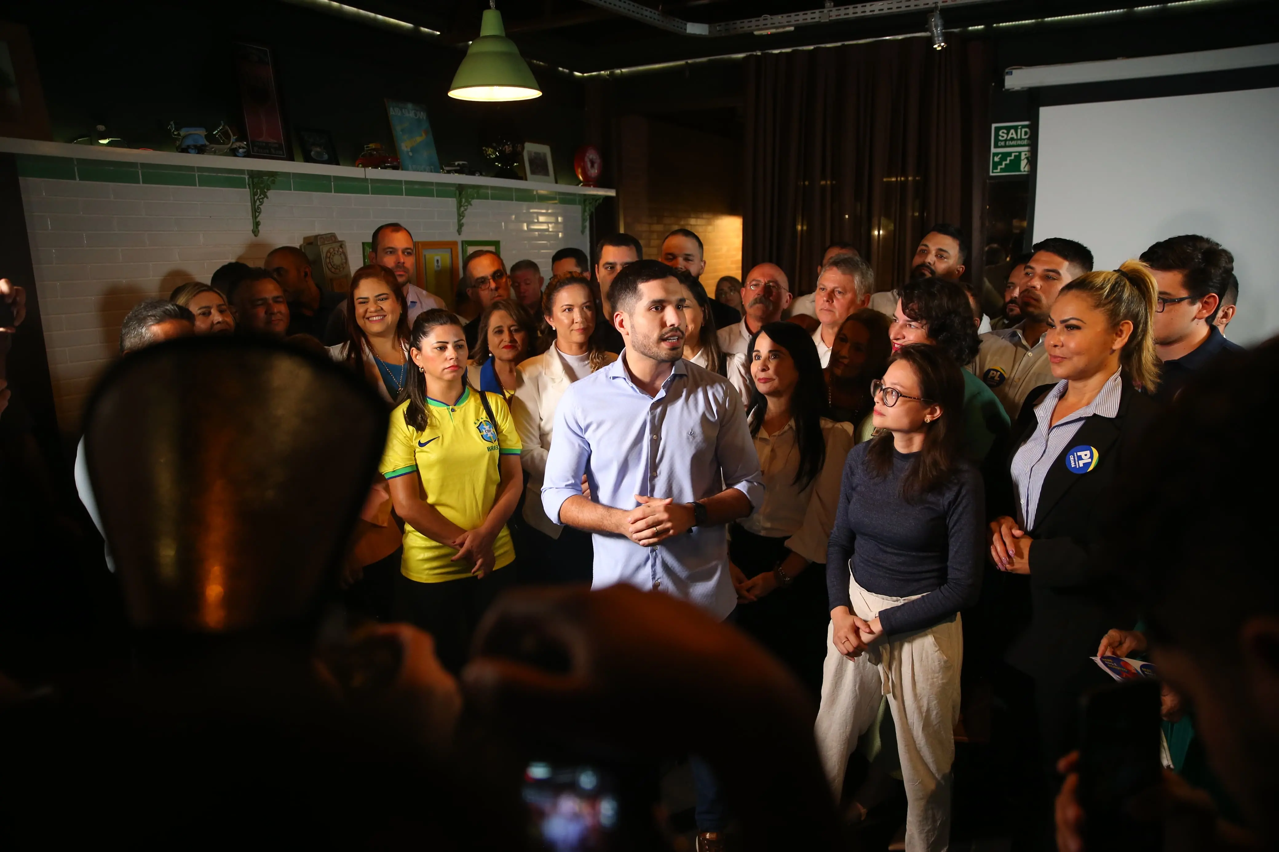 André Fernandes abriu o evento assinando a lista de presentes na convenção. Depois, o candidato e a vice da chapa fizeram um discurso rápido para os apoiadores e falaram com a imprensa.