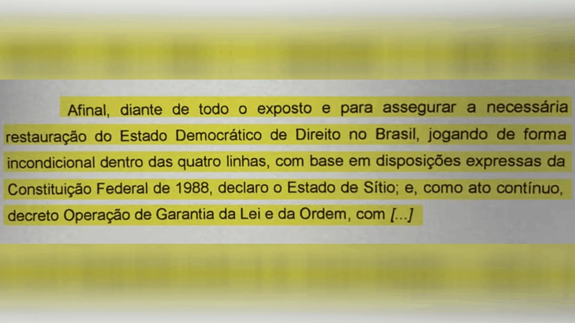 “Afinal, diante de todo o exposto, e para assegurar a necessária restauração do Estado Democrático de Direito no Brasil, jogando de forma incondicional dentro das quatro linhas, com base em disposições expressas da Constituição Federal de 1988, declaro o estado de Sítio e, como ato contínuo, decreto operação de garantia da lei e da ordem”.