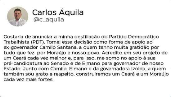"Tomei essa decisão como forma de apoio ao ex-governador Camilo Santana, a quem tenho muita gratidão por tudo que fez por Moraújo", escreveu.