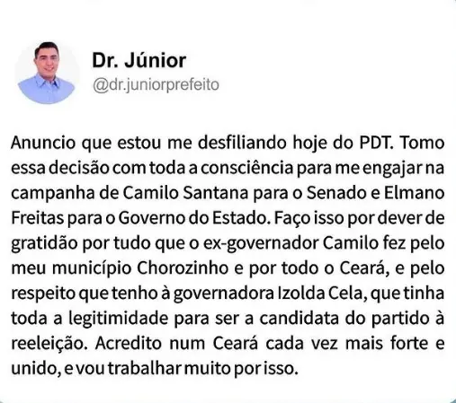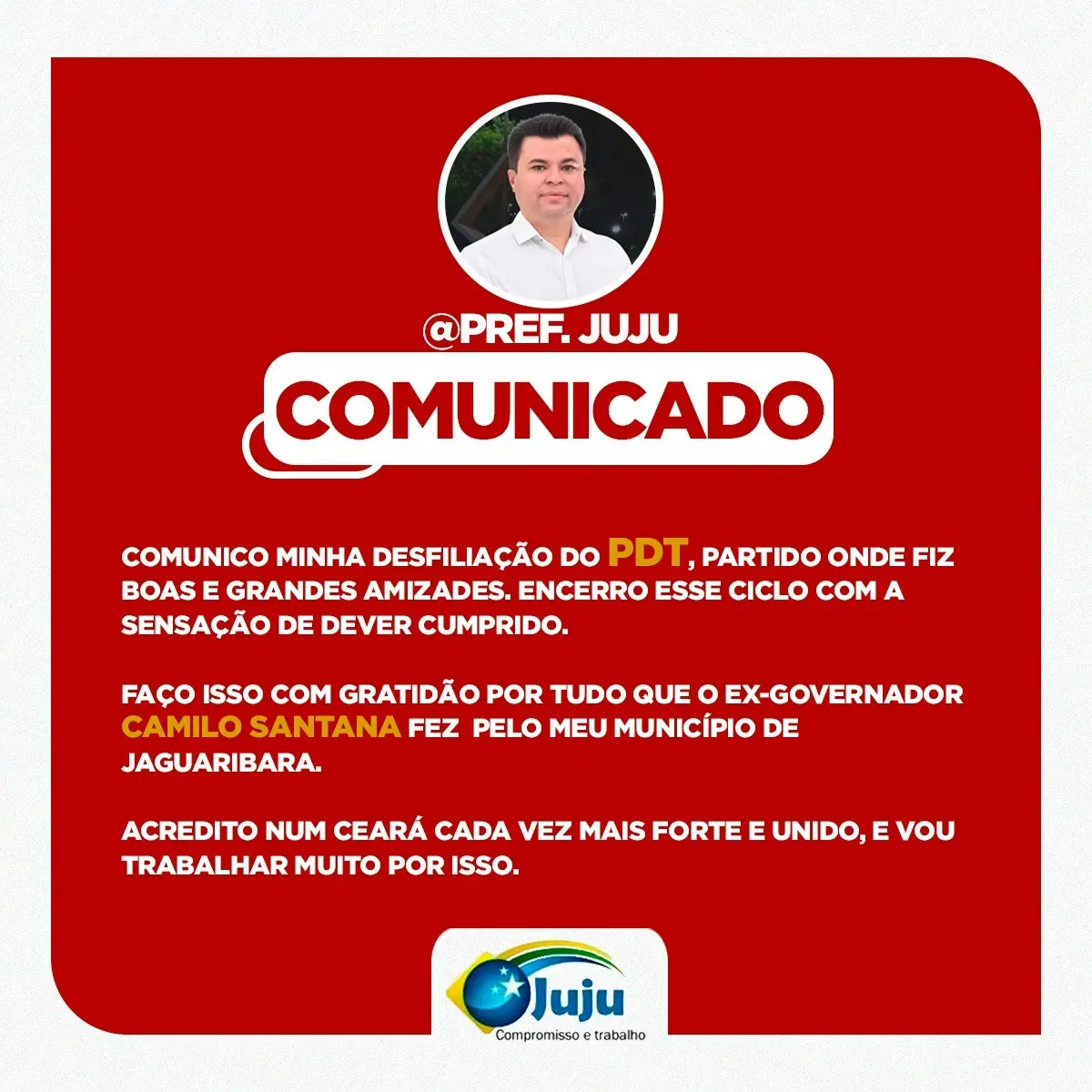 Quem também desembarcou do PDT foi o prefeito de Jaguaribara, Dr. Juju. Pelas redes sociais, o gestor justificou a saída argumentando que a decisão é fruto de "gratidão" ao ex-governador.