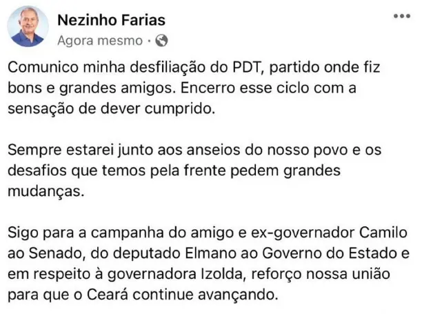 Nezinho Farias também anunciou nas redes sociais a desfiliação do PDT. O prefeito deixou claro que vai apoiar a candidatura petista ao Palácio da Abolição.