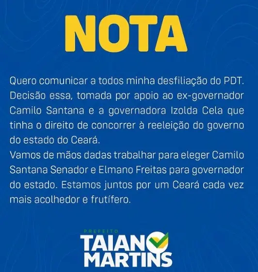 O prefeito de Tarrafas, Taiano Martins, anunciou, nesta sexta-feira (29), desfiliação do PDT para apoiar a candidatura do PT ao Governo do Estado.