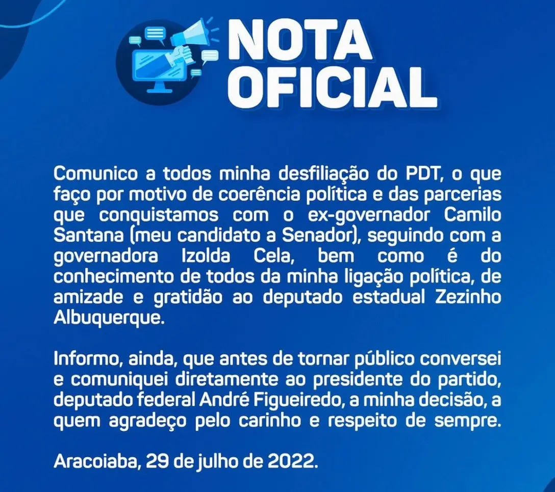 Nesta sexta (29), o prefeito de Aracoiaba, Thiago Campelo Nogueira, anunciou a saída do PDT. "Faço por motivo de coerência política e das parcerias que conquistamos com o ex-governador Camilo Santana", disse o gestor.
