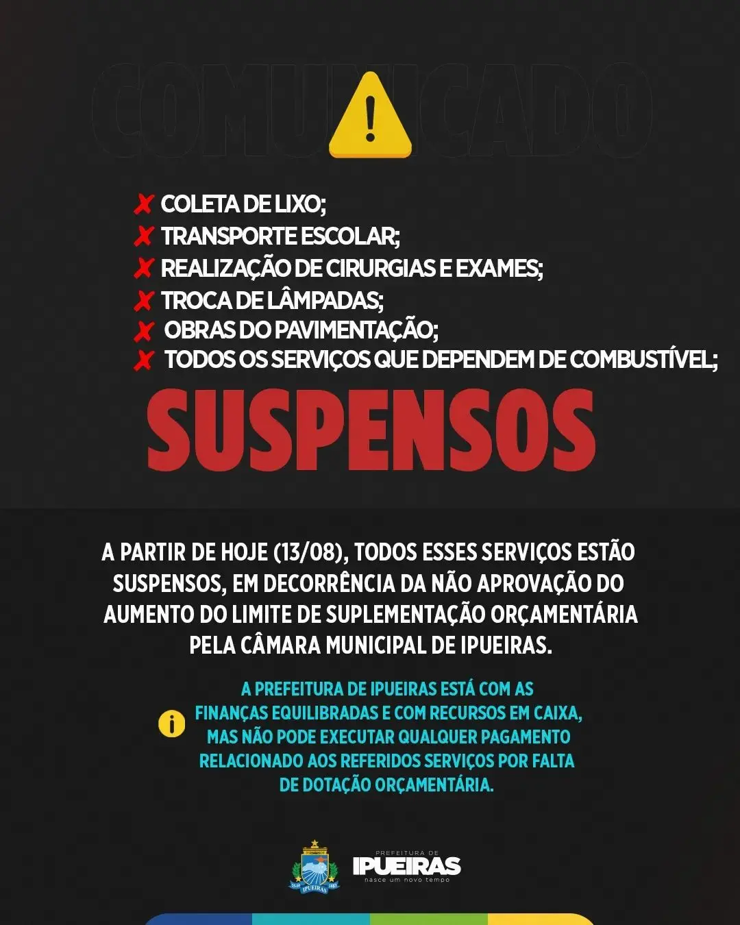 A Prefeitura de Ipueiras anunciou à população, neste sábado (13), a suspensão de serviços públicos. Conforme a prefeitura, a medida foi tomada por não haver limite de crédito legais para a gestão cumprir com as obrigações.