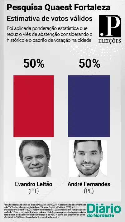 A terceira e última pesquisa Quaest do segundo turno em Fortaleza, divulgada neste sábado (26), véspera da eleição, mostra que Evandro Leitão (PT) e André Fernandes (PL) estão numericamente empatados, com cada um com 50% dos votos válidos.