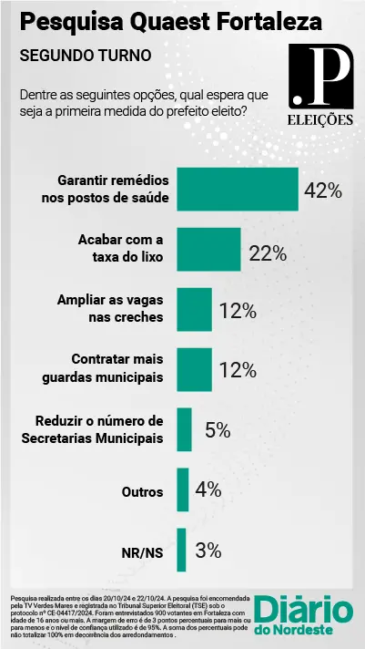 A segunda pesquisa Quaest do segundo turno em Fortaleza, divulgada nesta quarta-feira (23), mostra o que os eleitores esperam que seja a primeira medida do prefeito eleito neste ano. Com ampla margem de vantagem, “garantir remédios nos postos de saúde” é a prioridade apontada com mais frequência.