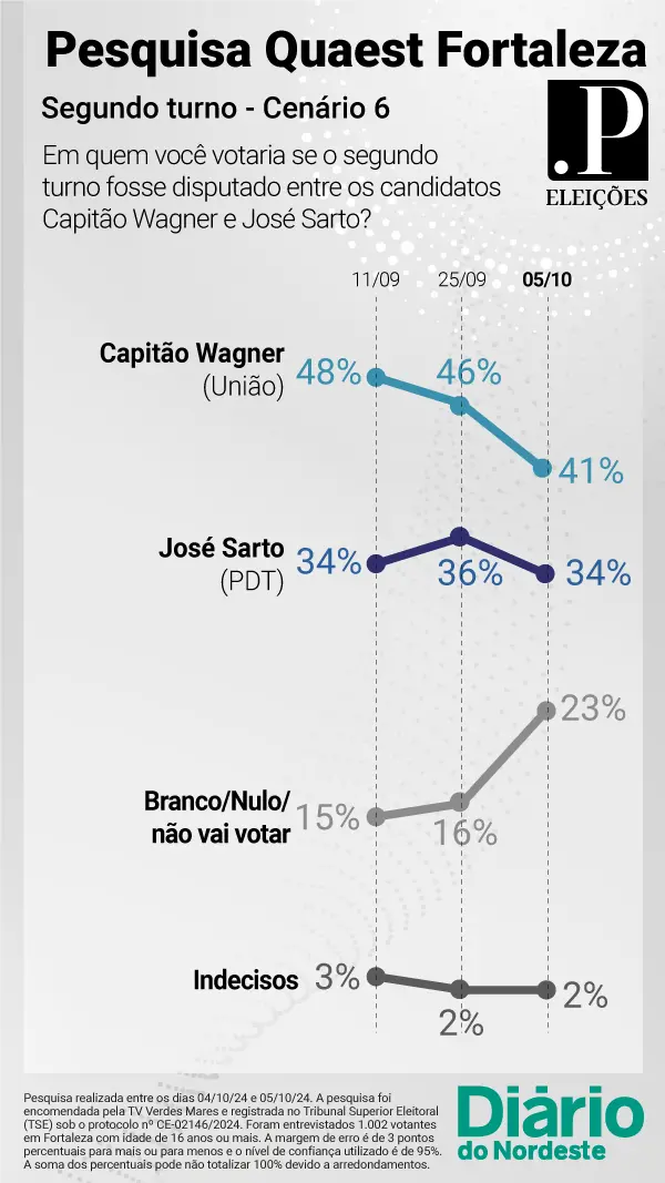Segundo o levantamento divulgado neste sábado, em caso de confronto entre os candidatos Capitão Wagner (União) e José Sarto (PDT), o candidato do União está à frente com 41%. Já o candidato do PDT tem 34%.