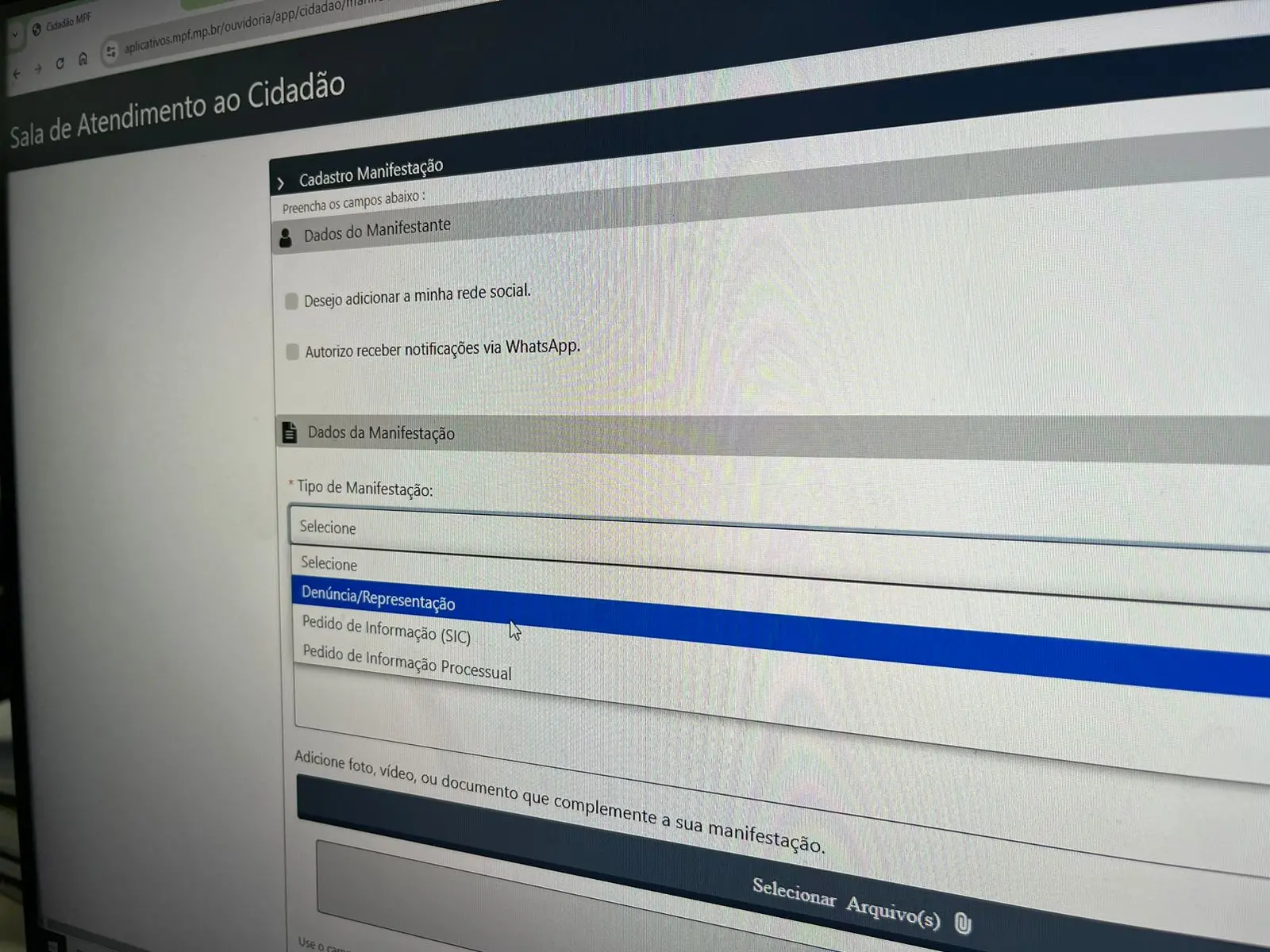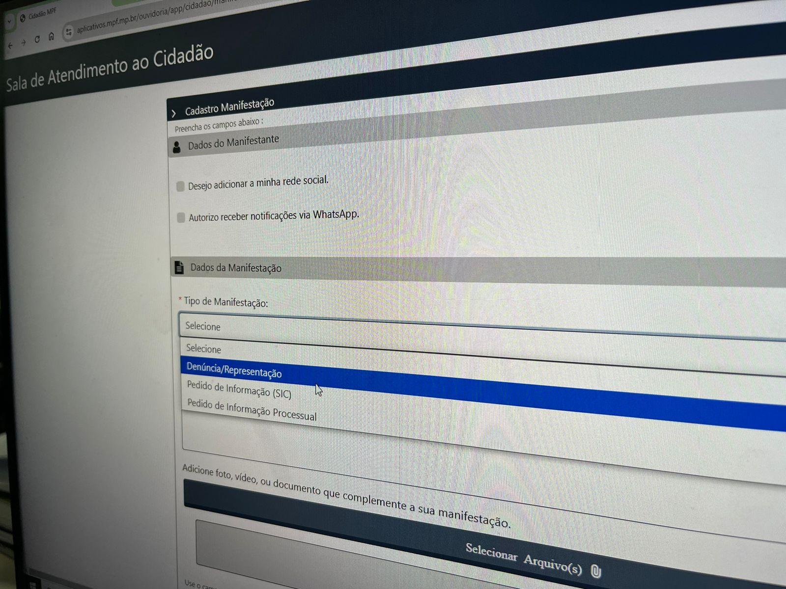 A denúncia também pode ser feita de forma presencial em uma Sala de Atendimento ao Cidadão em unidades físicas do MPF. (Confira aqui lista com a localização das unidades) Além disso, é possível, por se tratar de crime federal, denunciar à Polícia Federal.