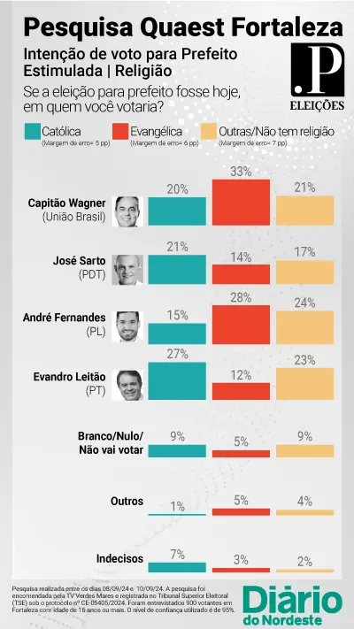 A segunda rodada da pesquisa Quaest sobre a disputa pela Prefeitura de Fortaleza, divulgada nessa quarta-feira (11), estratificou as intenções de voto segundo a religião do eleitorado no cenário estimulado. Para a realização do levantamento, foram consideradas as crenças católica, evangélica e outras/não tem religião.