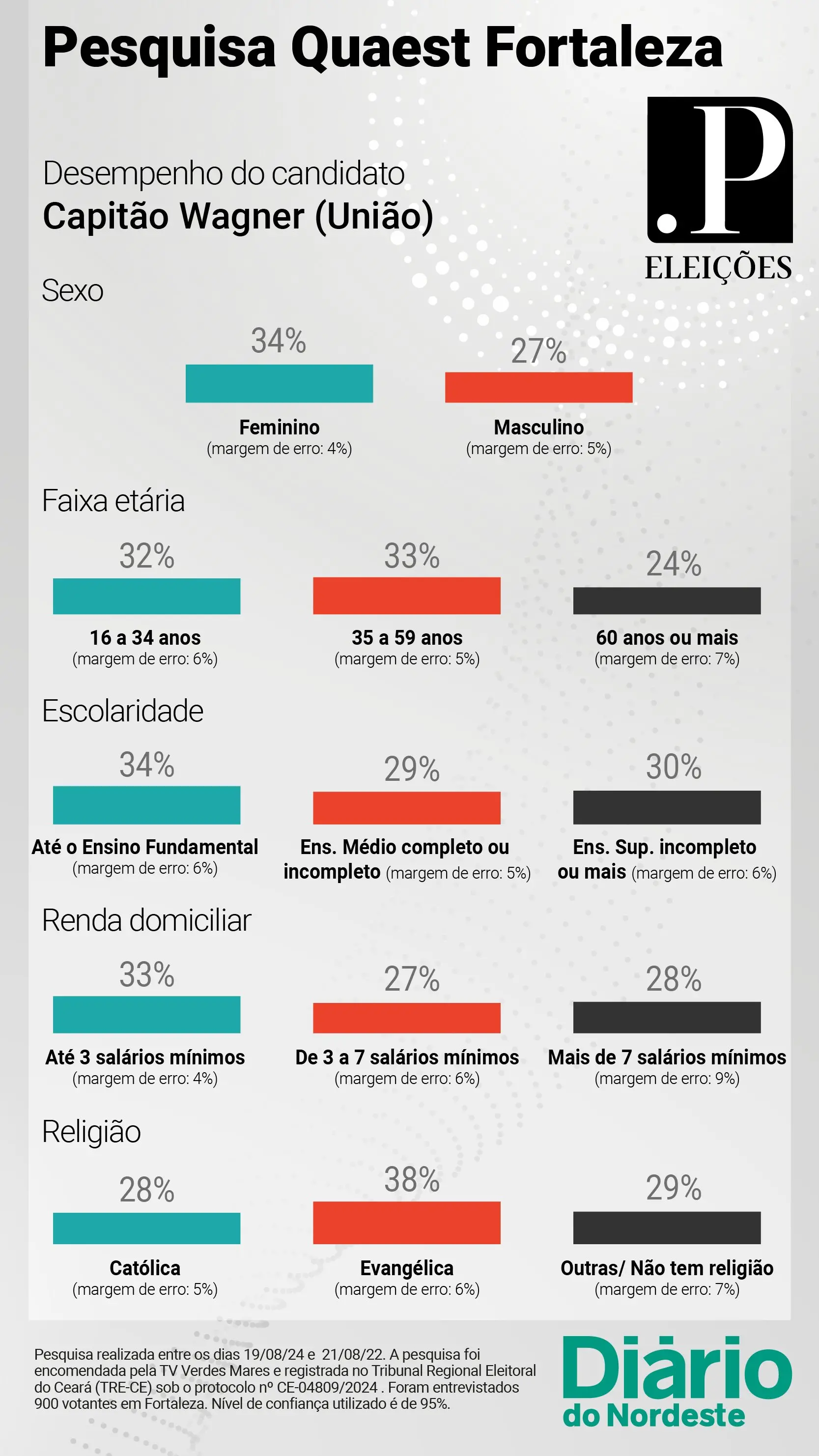 A pesquisa foi realizada pelo instituto Quaest e está registrado no Tribunal Superior Eleitoral (TSE) sob número CE-04809/2024. O índice de confiabilidade é de 95%. Os 900 eleitores foram ouvidos de forma presencial em bairros da capital cearense.
