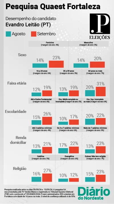 Ao todo, Evandro tem 21% das intenções de voto na Capital. Ele está tecnicamente empatado com Capitão Wagner (União), que tem 24%; André Fernandes (PL), 21%; e José Sarto (PDT), 18%. O postulante do PT, no entanto, teve oscilações positivas (dentro da margem de erro) ou crescimentos (variações além da margem de erro) em todas as estratificações.