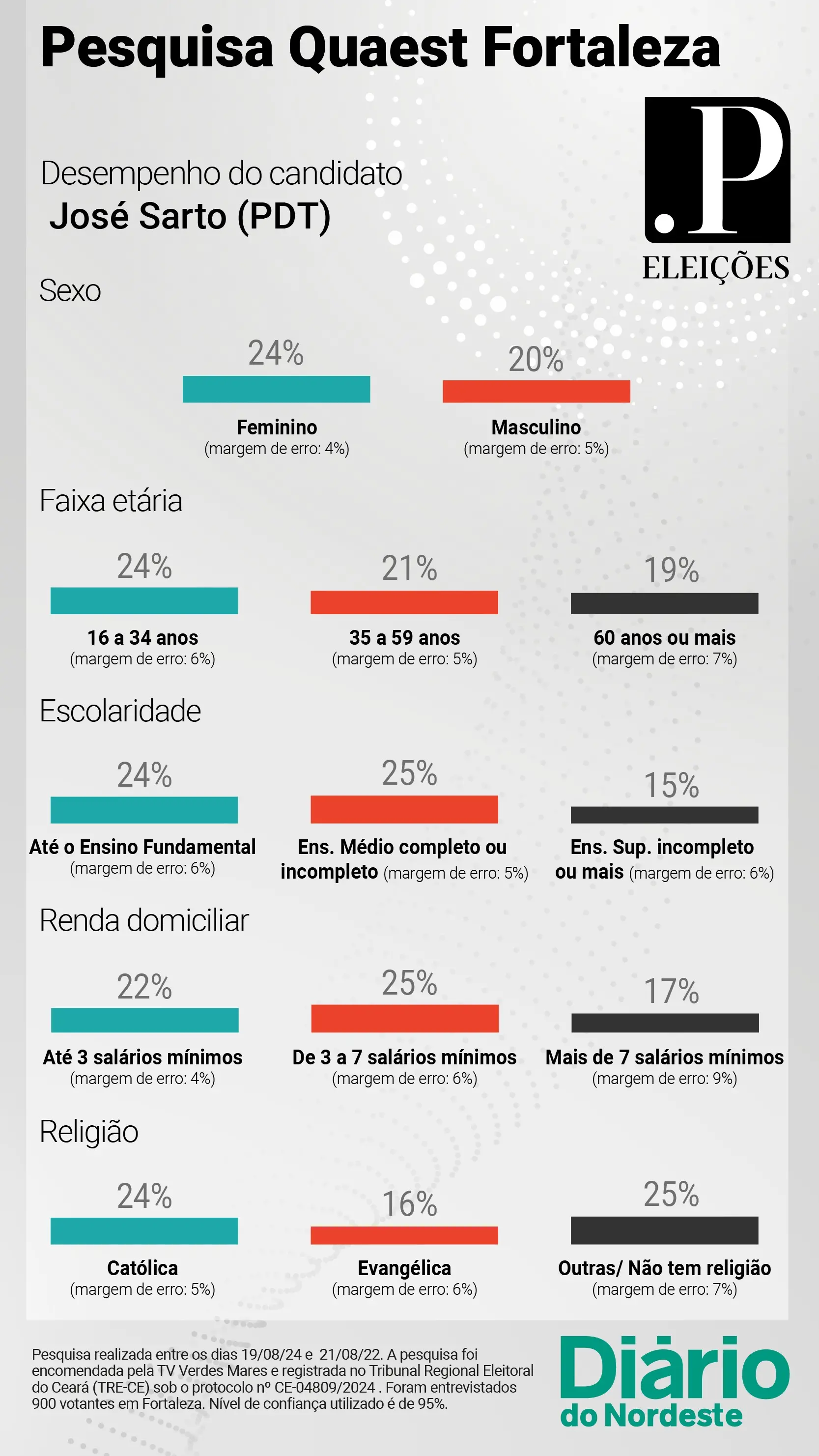 A pesquisa foi realizada pelo instituto Quaest e está registrado no Tribunal Superior Eleitoral (TSE) sob número CE-04809/2024. O índice de confiabilidade é de 95%. Os 900 eleitores foram ouvidos de forma presencial em bairros da capital cearense.