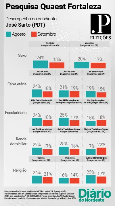 A segunda pesquisa Quaest para a disputa pela Prefeitura de Fortaleza, divulgada na quarta-feira (11), mostra que o candidato José Sarto (PDT), numericamente, tem o melhor desempenho entre o eleitorado feminino, pessoas com idade entre 35 e 59 anos e em duas fatias de escolaridade: aqueles que têm até o Ensino Fundamental e entre pessoas com Ensino Superior incompleto ou mais. O candidato também encontra apoio maior entre pessoas com renda de mais de sete salários mínimos e entre católicos.