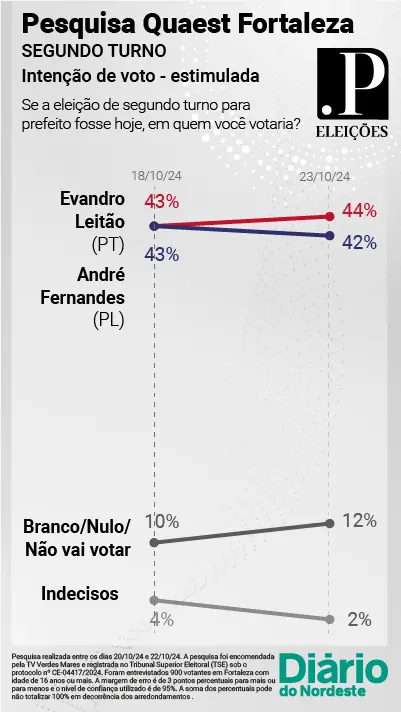 A primeira rodada da pesquisa Quaest do segundo turno em Fortaleza foi divulgada no último dia 18 de outubro. A segunda foi veiculada no dia 23 de outubro.
